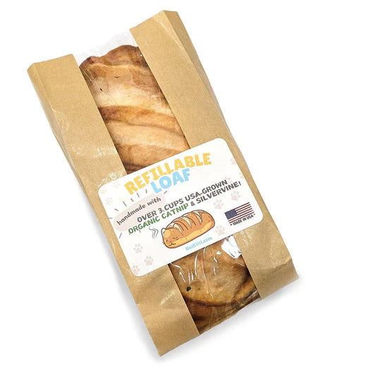 Details: This refillable, 9 inch loaf is stuffed with just over 3 CUPS of fresh, seasonal catnip. Our toys have (more than 1 tablespoon of catnip) NO polyester filling--it's ALL catnip and a little shake of silvervine powder for that extra KICK.